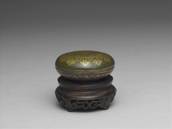 器呈扁圓形,弧形蓋頂、嵌入式器口。矮圈足。全器掛深綠色之茶葉末釉,釉面勻而潤。紋飾主要為描金間以銀色小點點之。紋飾蓋面為十二瓣團花,盒身為花瓣紋及雷紋。底有描金印款「大清乾隆年製」,篆書,分三行。