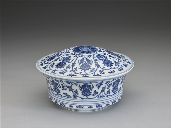 侈口,深壁,平底,矮圈足,帶圓頂蓋。器壁與蓋面均畫纏枝蓮花紋,上托佛教八吉祥紋,器底邊上畫蓮花及葉(均各自獨立,一花一葉)一周。蓋頂心畫花卉一朵,花紋間及足壁均加飾青線。胎骨較厚,青花釉色濃艷,深淺不勻,白釉泛青。圈足及蓋足露胎,胎質細白並帶鐵質斑點,胎釉一線呈淺橘色。器內及蓋內底均書「大明宣德年製」二行六字楷款,器內款識並加雙圈。