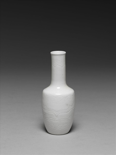 器形為小盤口,長頸,寬斜肩,直腹,淺圈足,器身修長。口沿一圈幾盒三角紋為飾,下連一圈獸面紋;肩下一獸面紋,疊以雲紋,全器施以透明釉,整體素淨優雅,潔白瑩麗。白釉的含鐵量比其他瓷土所燒製成的陶瓷為低,約為低於百分之一左右,然後再施以透明釉,始於北朝,發展至今。