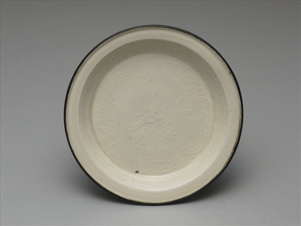 敞口淺壁盤,盤口寬折沿出唇鑲銅邊,緣一周凸起稜邊;矮圈足,淺凹為底,帶有氣孔及凹圈,無款。器內壁捲雲紋;盤心為雙鳥紋,作同側展翅飛翔之貌,間以木葉紋,八瓣花紋,卷草文及雲紋。此盤模印清晰,胎略厚,滿施牙白釉,僅覆燒的口沿露胎。構圖呈現出雙鳧振翅同翔的姿態,間以傳統吉祥圖案,傳達出雙宿雙飛,夫妻同心的祝賀意義。定窯為宋代五大名窯之一,唐代開始燒造白瓷,至於金元而衰,歷史長達六七百年之久;定窯以白瓷為主,然尚有黑釉、醬釉、綠釉等品種,於曹昭《格古要論》中可見記載。