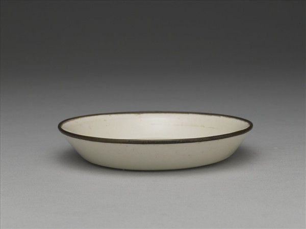 碟,敞口、淺壁,腹下近底處斜削一周,平底。全器光素無紋,釉色牙白,口鑲銅稜釦。是定窯常見的器形,有20cm左右的盤,及15cm以下的碟,平底、臥足,兼有之。考古遺址所見,素色無紋盤碗的數量最多。本器呈現牙白潤澤的釉光,以覆燒成器。