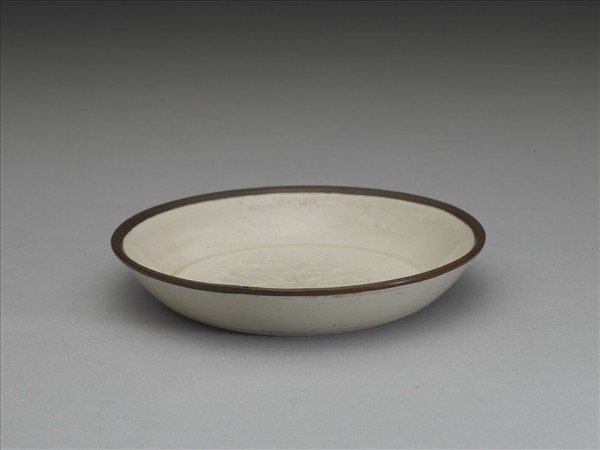 敞口,淺壁稍折腰,底微凹入,矮圈足。口沿起細稜無釉微露胎,鑲銅釦。底面劃花為飾,斜出折枝帶葉蓮花,一朵盛開的花朵姿態搖曳,刻劃幾筆,生動自然。全器滿釉,僅口邊窄沿鑲銅釦微露胎。定窯為宋代五大名窯之一,唐代開始燒造白瓷,至於金元而衰,歷史長達六七百年之久;定窯以白瓷為主,然尚有黑釉、醬釉、綠釉等品種,於曹昭《格古要論》中可見記載。