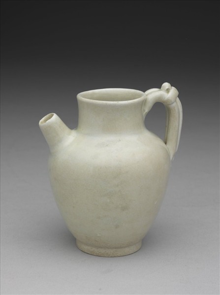 寬直頸,口緣微外敞,肩豐圓,腹向下斜收,矮圈足,足形刻削平整。短流曲,把分三稜,作結帶式,在曲聳高處飾繩結,銜接頸部與腹最寬處;把高過口沿,結頂有一小孔。流稍矮。釉汁勻淨潤澤,色略灰青,施釉不及底,底足均露白色胎。屬邢窯型作品。