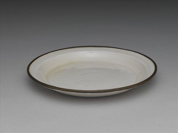 敞口淺壁,圓腹,盤口平折,口沿一周鑲銅釦;細圈足,淺凹為底,無款。器內壁一圈劃花卷雲紋;盤心為雙鳥展翅,旁綴有花卉紋,草葉紋及卷雲紋。圖案模印清晰,從鳥的羽毛,雲紋的深淺陰暗皆表現的栩栩如生,構圖優雅細緻,錦簇中不失平衡。除底外滿施牙白釉,僅覆燒的口沿露胎。定窯為宋代五大名窯之一,唐代開始燒造白瓷,至於金元而衰,歷史長達六七百年之久;定窯以白瓷為主,然尚有黑釉、醬釉、綠釉等品種,於曹昭《格古要論》中可見記載。
