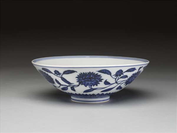 侈口,淺壁,矮圈足。外壁畫纏枝番蓮花六朵,底邊畫蓮瓣紋一周,口足間加飾青線六道。碗內底心畫葵花一朵,邊加雙線,周壁純白無紋飾。底有青花書「大明宣德年製」二行六字楷款,外加雙圈。