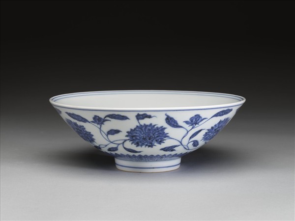 侈口,淺壁,矮圈足。外壁畫纏枝番蓮花六朵,底邊畫蓮瓣紋一周,口足間加飾青線六道。碗內底心畫葵花一朵,邊加雙線,周壁純白無紋飾。底有青花書「大明宣德年製」二行六字楷款,外加雙圈。