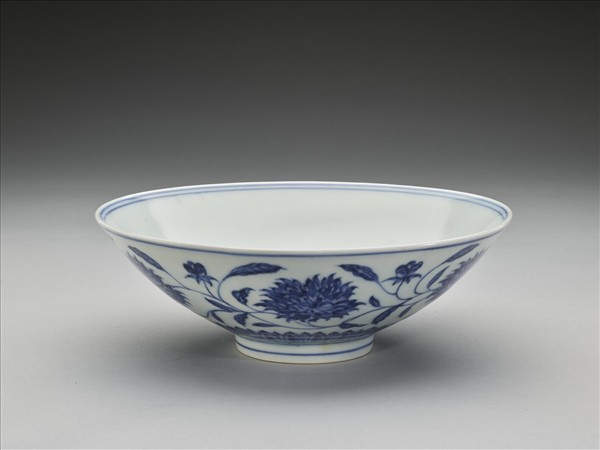 侈口,淺壁,矮圈足。外壁畫纏枝番蓮花六朵,底邊畫蓮瓣紋一周,口足間加飾青線六道。碗內底心畫葵花一朵,邊加雙線,周壁純白無紋飾。底有青花書「大明宣德年製」二行六字楷款,外加雙圈。