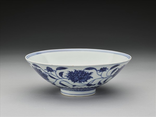 侈口,淺壁,矮圈足。外壁畫纏枝番蓮花六朵,底邊畫蓮瓣紋一周,口足間加飾青線六道。碗內底心畫葵花一朵,邊加雙線,周壁純白無紋飾。底有青花書「大明宣德年製」二行六字楷款,外加雙圈。