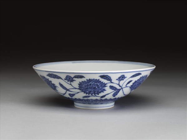 侈口,淺壁,矮圈足。外壁畫纏枝番蓮花六朵,底邊畫蓮瓣紋一周,口足間加飾青線六道。碗內底心畫葵花一朵,邊加雙線,周壁純白無紋飾。底有青花書「大明宣德年製」二行六字楷款,外加雙圈。
