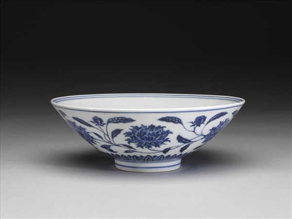 侈口,淺壁,矮圈足。外壁畫纏枝番蓮花六朵,底邊畫蓮瓣紋一周,口足間加飾青線六道。碗內底心畫葵花一朵,邊加雙線,周壁純白無紋飾。底有青花書「大明宣德年製」二行六字楷款,外加雙圈。
