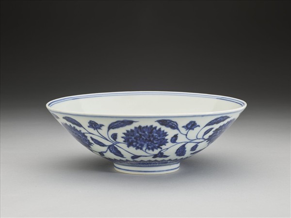 侈口,淺壁,矮圈足。外壁畫纏枝番蓮花六朵,底邊畫蓮瓣紋一周,口足間加飾青線六道。碗內底心畫葵花一朵,邊加雙線,周壁純白無紋飾。底有青花書「大明宣德年製」二行六字楷款,外加雙圈。