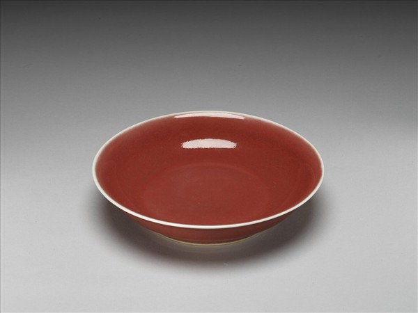 侈口窄唇,淺弧形壁,矮圈足。全器施霽紅釉,施釉至足邊,口沿與足邊各留一道白邊,足緣無釉露白胎。足內壁及底施白釉,底有青花書「大明宣德年製」六字二行楷款,外加雙圈。