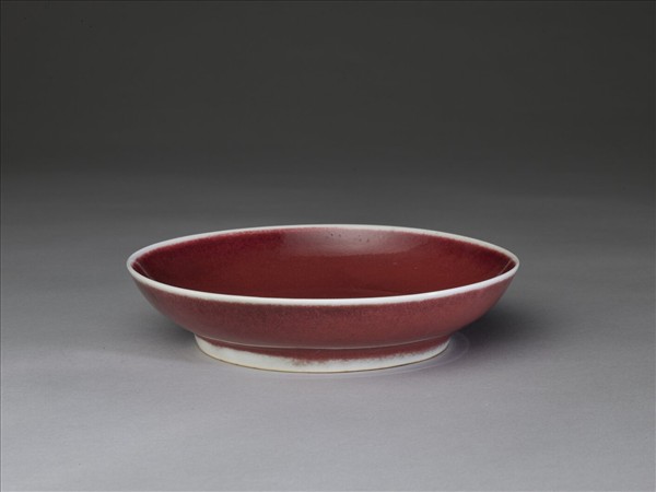 侈口窄唇,淺弧形壁,矮圈足。全器施霽紅釉,施釉至足邊,口沿與足邊各留一道白邊,足緣無釉露白胎。足內壁及底施白釉,底有青花書「大明宣德年製」六字二行楷款,外加雙圈。