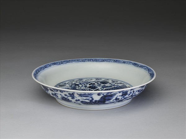 侈口窄唇,淺壁弧形,矮圈足。內面口沿下畫勾雲紋一週,盤心與外壁各畫鳳凰一對,隙地滿飾纏枝番蓮花,內外分飾青線八道。內壁純白,樸素無紋飾。 底有青花書「大明宣德年製」六字二行楷款,外加雙圈。
