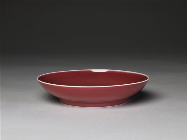 侈口,淺壁弧形,矮圈足。盤心淺劃雲紋三朵,薄胎質,內外滿施霽紅釉,盤底純白,口沿露白邊。底有青花書「大明宣德年製」六字二行楷款,外加雙圈。