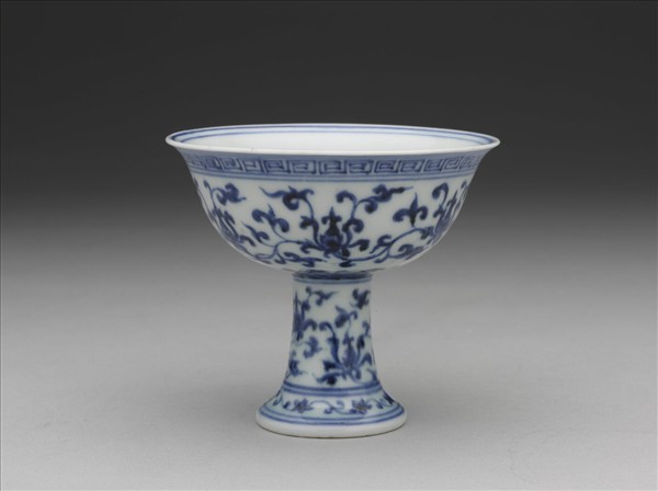 撇口,深弧壁,高足外侈,平底。外壁及高足皆飾纏枝番蓮紋,口沿畫回紋一道,底邊為如意雲紋。內、外口沿、底邊、高足上下各加飾青線二道。器內心有青花書「大明宣德年製」二行六字楷款,外加雙圈。