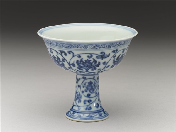 撇口,淺弧壁,高足外侈,平底。此類高足盃,通常靶足中空,素坯時高足上部與盃底接合,底不施釉,故底部為露胎平滑砂底。外壁及高足皆飾纏枝蓮紋,口沿卷草紋,底邊為蕉葉紋。內、外口沿、底邊、高足上下各加飾青線二道。青花濃艷,白釉泛青,胎骨勻薄,足底白胎堅細。器內心青花書「大明宣德年製」二行六字楷款,外加雙圈。