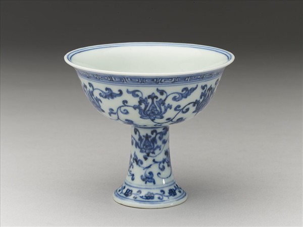 撇口,深弧壁,高足外侈,平底。外壁及高足皆飾纏枝番蓮紋,口沿畫回紋一道,底邊為如意雲紋。內、外口沿、底邊、高足上下各加飾青線二道。器內心有青花書「大明宣德年製」二行六字楷款,外加雙圈。