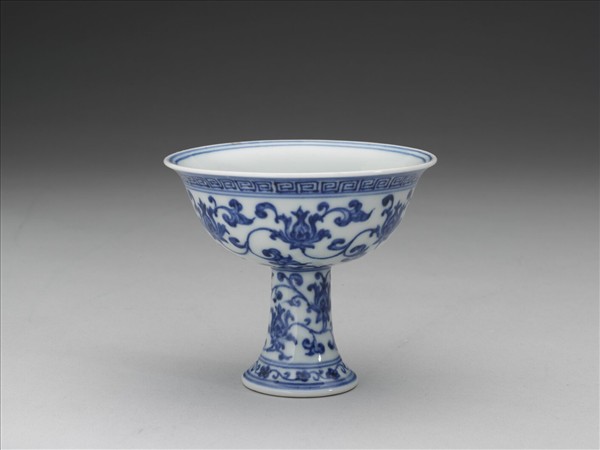 撇口,深弧壁,高足外侈,平底。外壁及高足皆飾纏枝番蓮紋,口沿畫回紋一道,底邊為如意雲紋。內、外口沿、底邊、高足上下各加飾青線二道。器內心有青花書「大明宣德年製」二行六字楷款,外加雙圈。