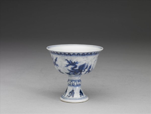 撇口,盃身,高足外撇,凸節把,又稱竹節靶盃。盃把中空,盃底與高足接合,淺圈足。波濤以淡青鉤邊後留白,海獸則以濃青畫成,紋飾清晰,釉色濃艷帶褐斑,為宣德窯青花波濤海獸紋高足盃中之珍品。外底書「大明宣德年製」二行六字楷款,外加雙圈。