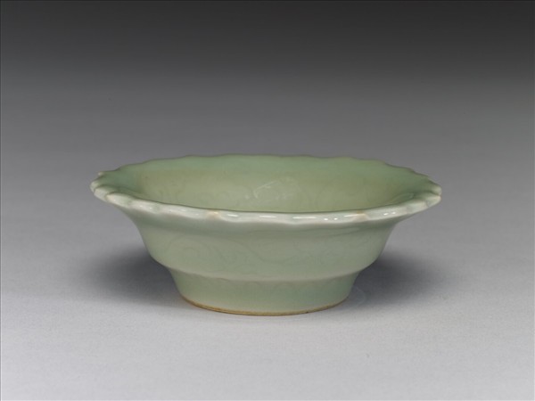 八瓣蓮花形,侈口,淺壁,矮圈足。內外壁淺劃纏枝花卉,底邊劃蓮瓣紋。胎質較厚,釉色翠青。碟心有青花書「大明宣德年製」二行六字楷款。