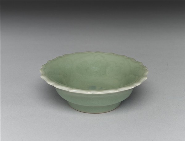 八瓣蓮花形,侈口,淺壁,矮圈足。內外壁淺劃纏枝花卉,底邊劃蓮瓣紋。胎質較厚,釉色翠青。碟心有青花書「大明宣德年製」二行六字楷款。