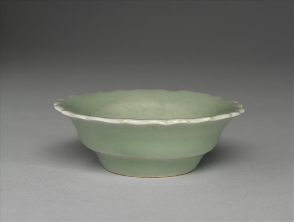 八瓣蓮花形,侈口,淺壁,矮圈足。內外壁淺劃纏枝花卉,底邊劃蓮瓣紋。胎質較厚,釉色翠青。碟心有青花書「大明宣德年製」二行六字楷款。