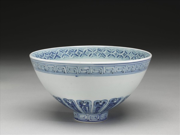 圓直口,深弧壁,小圈足,碗心內凹呈尖底狀,底微凸,俗稱雞心碗,一般因其碗形頗似蓮房,俗又稱「蓮子碗」。外壁口沿、圈足均飾回紋一周,底邊蓮瓣紋一周,中段留白。內口沿下畫錢紋一周,碗心為八瓣圖案花一朵,應為變形蓮的一種,外加阿拉伯圖案紋二層。底青花書「大明宣德年製」六字二行楷款,外加雙圈。
