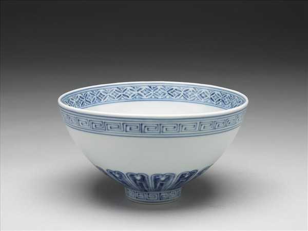 圓直口,深弧壁,小圈足,碗心內凹呈尖底狀,底微凸,俗稱雞心碗,一般因其碗形頗似蓮房,俗又稱「蓮子碗」。外壁口沿、圈足均飾回紋一周,底邊蓮瓣紋一周,中段留白。內口沿下畫錢紋一周,碗心為八瓣圖案花一朵,應為變形蓮的一種,外加阿拉伯圖案紋二層。底青花書「大明宣德年製」六字二行楷款,外加雙圈。
