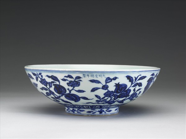 敞口微斂,寬口沿,淺弧壁,平底圈足,外壁繪折枝石榴、桃、枇杷、林檎、葡萄、柿子等六種四季花果,底邊飾蓮瓣一周,足壁畫花葉六朵,口、足加飾青線,器內無紋飾。青花濃艷泛紫,帶鐵褐色疵斑,碗內白釉泛青色,釉面橘皮紋明顯。胎骨厚重,圈足露胎寬平,胎質潔白細膩,胎釉一線淺泛橙色,並帶鐵黑斑點。外壁口沿下、石榴上方書有「大明宣德年製」一行六字楷款。