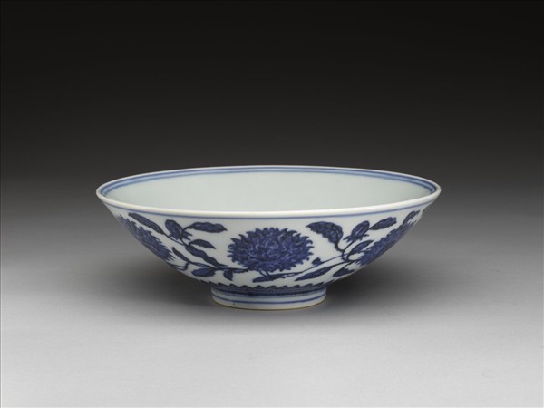 侈口,淺壁,矮圈足。外壁畫纏枝番蓮花六朵,底邊畫蓮瓣紋一週,口足間加飾青線六道。碗內底心畫葵花一朵,邊加雙線,週壁純白無紋飾。底有青花書「大明宣德年製」二行六字楷款,外加雙圈。