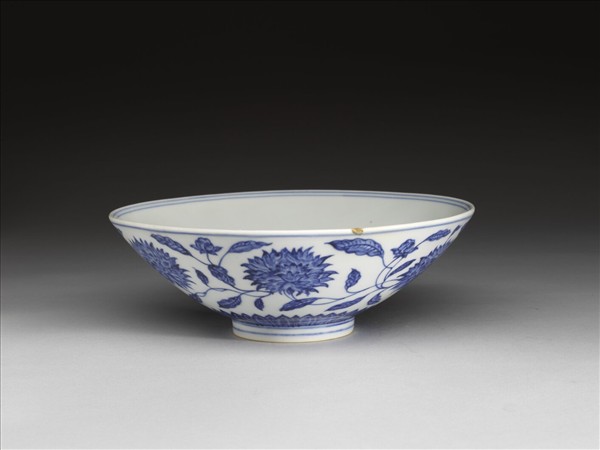 侈口,淺壁,矮圈足。外壁畫纏枝番蓮花六朵,底邊畫蓮瓣紋一週,口足間加飾青線六道。碗內底心畫葵花一朵,邊加雙線,週壁純白無紋飾。底有青花書「大明宣德年製」二行六字楷款,外加雙圈。