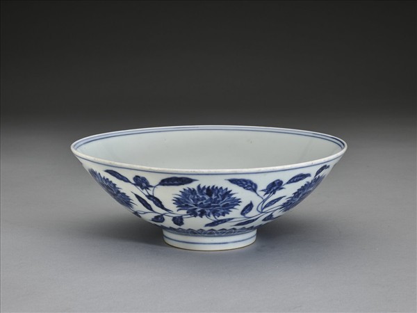 侈口,淺壁,矮圈足。外壁畫纏枝番蓮花六朵,底邊畫蓮瓣紋一週,口足間加飾青線六道。碗內底心畫葵花一朵,邊加雙線,週壁純白無紋飾。底有青花書「大明宣德年製」二行六字楷款,外加雙圈。