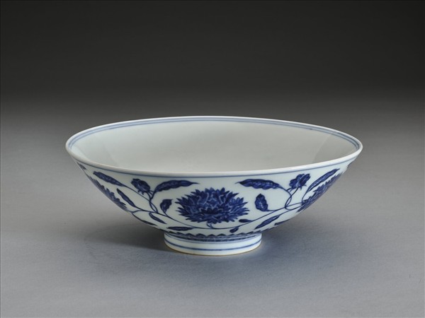侈口,淺壁,矮圈足。外壁畫纏枝番蓮花六朵,底邊畫蓮瓣紋一週,口足間加飾青線六道。碗內底心畫葵花一朵,邊加雙線,週壁純白無紋飾。底有青花書「大明宣德年製」二行六字楷款,外加雙圈。