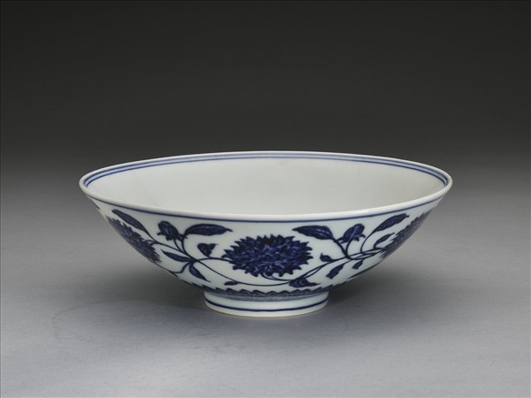侈口,淺壁,矮圈足。外壁畫纏枝番蓮花六朵,底邊畫蓮瓣紋一週,口足間加飾青線六道。碗內底心畫葵花一朵,邊加雙線,週壁純白無紋飾。底有青花書「大明宣德年製」二行六字楷款,外加雙圈。