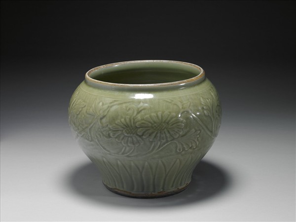 廣口大罐,直口、短唇,圓弧形腹,最大徑在中上段,腹下斂,足圈斜切削成,胎厚重,底面另以釉接方式黏接一餅狀底。上腹部以剔地拱花方式浮雕纏枝花卉,主紋周邊隙地留有剔地平行或交錯的篾紋痕跡,線條工緻穩健。下腹為長條狀蓮瓣紋。釉灰濁凝厚,口圈、足圈無釉,內外底中央亦皆無釉,呈朱褐色。燒造時,內部應亦墊燒小件器。此種廣口罐在十四世紀經常出現,有的還有「清香美酒」之類的文字裝飾,宜其為酒器之用,應有蓋。