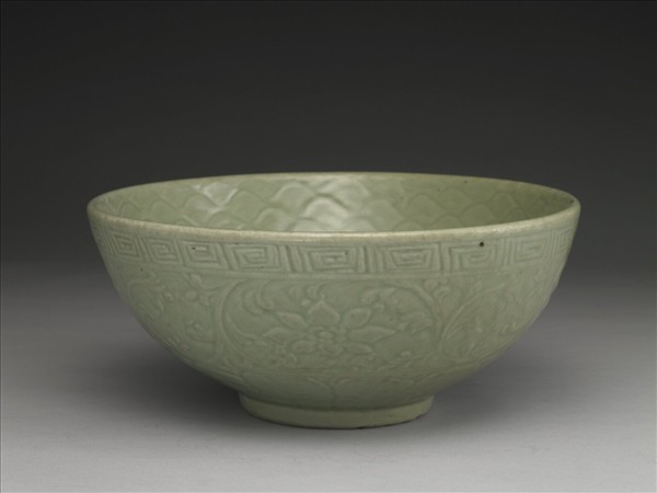 大碗,敞口,口緣微斂,弧形壁、圈足。外壁剔地拱花裝飾,口緣回紋一周,腹為纏枝花卉,浮拱厚,紋飾清晰,剔地的地面亦留剔刻的清晰線紋;腹下作寬蕉葉紋,鋸齒狀葉緣緊密相接。足端於燒成後刻意磨去一圈無釉,足裡底部寬環狀無釉墊燒區,中心另刻圓形凹陷有釉。器裡劃刻水波紋,層層相疊如鱗片,佈滿器壁;內底心似有模糊的印花一枝。釉色灰淡乳濁。類似的水波裝飾也見於明墓出土物。