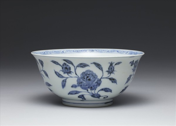 侈口窄唇,深壁,矮圈足。厚胎白泑。口唇上畫勾雲紋一週,盌心畫石榴一枝,內壁純白無紋飾。外壁畫牡丹、蓮花等四折枝,口足內外分飾青線七道。