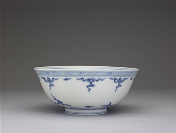 撇口弧壁大碗,帶直壁圈足,足著地處無釉,其內滿釉無款。碗心雙圈內數朵雲紋,外壁近口緣處以兩道複線間裝飾龜甲紋,腹壁亦描繪雲紋。近圈足處有波濤紋一圈,足壁飾三道弦紋。碗壁所飾雲紋與海水紋皆為貫穿明代的陶瓷紋飾,觀察其雲紋為捲雲頭花口並帶三或四足,輪廓邊緣留白,海水紋亦為兩圓頭形加上六指般的浪頭,頂端無點,風格介於宣德與成化之間。此器留白處甚多,特別是器腹間似乎預留裝飾空間,可能在青花繪飾後欲再加彩,是件未完之作。