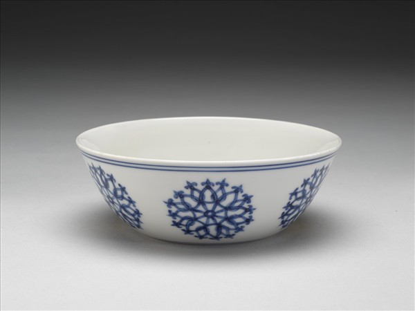 侈口,矮壁,平足底凹。外壁青花畫六朵雪花樣圖案花紋,器內素白無紋。口足各飾青線二道。底青花書「大明成化年製」雙圈六字楷款。