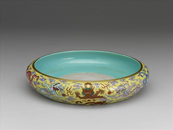斂口扁圓腹洗,口緣繪金邊,器身周圍,明黃地彩繪九龍戲珠於紅藍白三色祥雲間,中間描金紅龍,右粉色龍,左青白色,兩側藍、洋紅龍各一對,最後為綠龍與紅龍。器底心一部分露胎,其餘內壁與外底施松石綠釉,底有「大清嘉慶年製」篆書紅款。色彩濃麗有層次,畫工端整,為嘉慶洋彩瓷佳品。此外,院藏有題材與器型皆相似之嘉慶青花九龍洗。