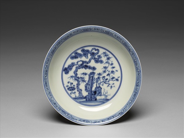 撇口窄唇,淺壁,圈足。以釉下青花繪飾,青花色澤較淡。盤外壁繪二組松、竹、梅等歲寒三友及湖石、靈芝等。盤內口緣一圈卷草紋,盤心繪松、竹、梅三友與湖石、靈芝。內外共飾青線八道。底青花書「大明成化年製」雙圈六字楷款。