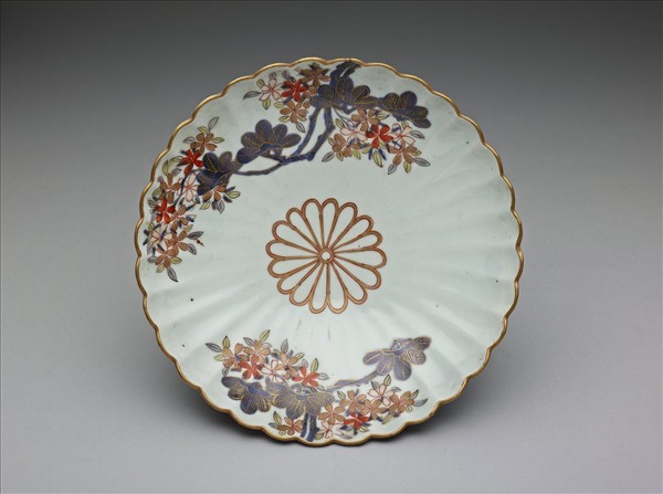 金襴手樣式菊瓣盤,口緣鑲銅釦,每瓣皆有突起稜線,為模製而成。盤壁內外以紅彩、金彩、藍彩作裝飾;盤心中央一紅邊金彩菊花紋,餘白描繪櫻花連枝帶葉的盛開模樣,盤壁並描繪太湖石、櫻花樹與風信子等。足外壁飾兩道青花稜線,中有紅色渦紋一圈。圈足著地處塗鐵汁,內繪青花弦紋開光,內置櫻花折枝紋。與其他類似作品比對後,可知此件應為碗蓋。