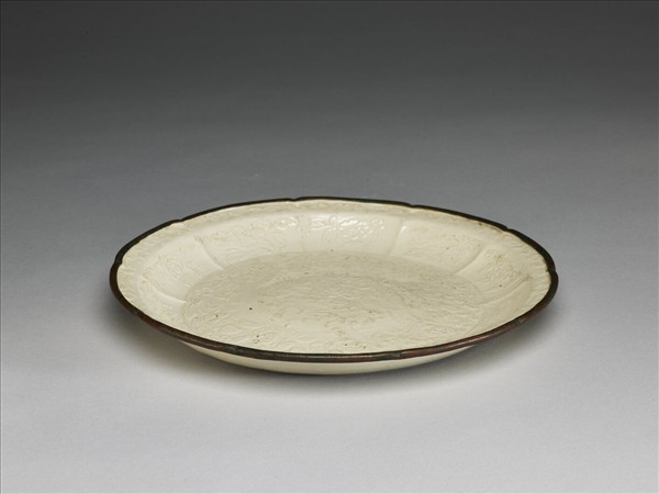 定窯 白瓷印花蓮塘鴛鴦紋牡丹花式盤