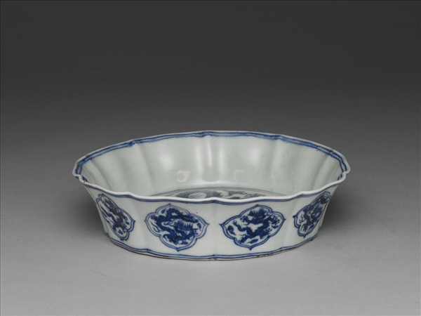 侈口,淺壁,內底心略拱,淺圈足,外底略凹,器口、器壁,與青花團龍紋高足碗的碗身相同,呈葵花形,十凹凸棱。惟紋飾此為雲龍及雙邊菱形開光內畫雲龍紋。胎壁勻薄,底稍厚,青釉濃艷,多帶黑褐疵斑,白釉泛青,圈足露胎,胎質堅細,間帶大小鐵質斑點。器底雙青圈內青花書「大明宣德年製」二行六字楷款。