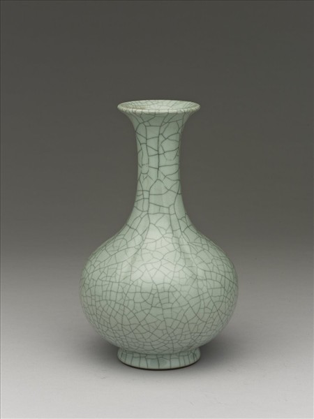 均侈口寬唇,長頸,碩腹,矮圈足。腹部分為六瓣。厚胎骨,釉色灰青,滿佈黑色紋片。足底露胎,塗有赭色汁。底有青花書「大清乾隆年製」六篆字款。