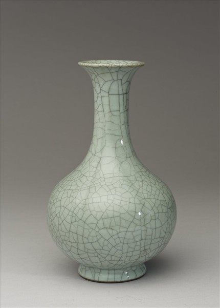 均侈口寬唇,長頸,碩腹,矮圈足。腹部分為六瓣。厚胎骨,釉色灰青,滿佈黑色紋片。足底露胎,塗有赭色汁。底有青花書「大清乾隆年製」六篆字款。