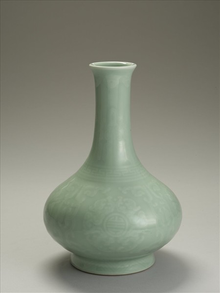 侈口窄唇,長頸,腹部扁圓,矮圈足。胎骨厚重,通體淺粉青色釉。腹部錐拱四圖壽字,週飾雙夔紋,隙地飾蟠螭紋四,底邊飾蓮瓣紋。頸上飾回紋一週及弦紋三道。足上飾尖角紋。底有青花書「大清乾隆年製」六篆字款。