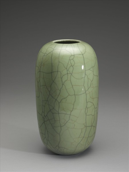 斂口,長腹,淺圈足。胎骨厚重,外面釉色深青微綠,器內色白帶灰。內外滿佈黑,黃色紋片,並多冷紋。足底露胎,塗有黑色原汁。