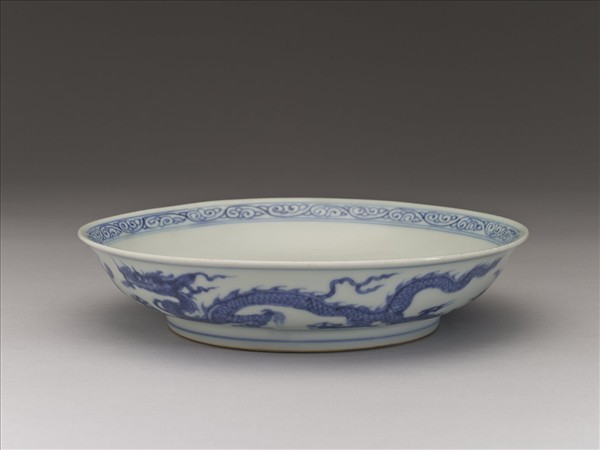 侈口窄唇,淺壁,矮圈足。內面口沿下畫卷草紋一周,盤心畫雲紋三朵,週壁無紋飾。外壁畫雙龍戲珠,加飾朵雲。內外分飾青線八道。底有青花書「大明正德年製」二行六字楷款,外加雙圈。
